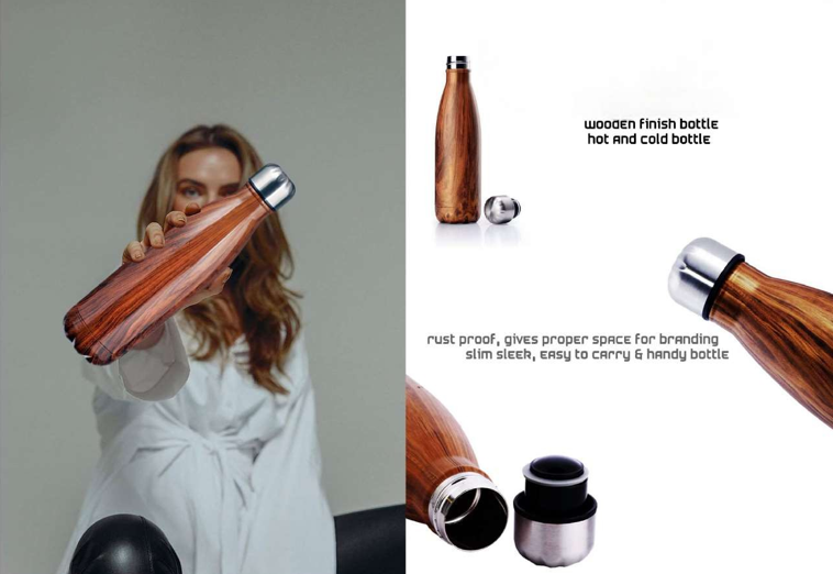 Stay hydrated in style with the Wooden Finish Cola Metal Bottle, the perfect blend of elegance, durability, and practicality.